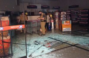 Os ladrões arrombaram a porta de entrada de um mercado em Campo Mourão com o carro em que estavam. O barulho da batida ecoou...