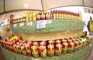 Nos estandes de alimentos, há diversas opções de biscoito de polvilho, molho de pimenta, mel, pão caseiro, embutido, geleia, cocada, paçoca, suco, vinho, entre...