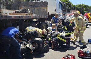 Motociclista fica preso embaixo de carreta